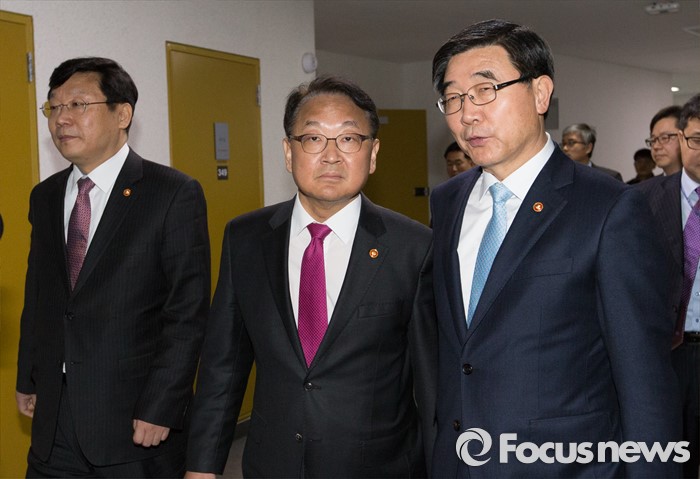 (세종=포커스뉴스) 유일호 경제부총리 겸 기획재정부장관이 1일 오전 세종시 정부세종청사 기재부 브리핑룸에서 청년과 아이들의 미래를 위한 국민 여러분께 드리는 말씀을 마치고 브리핑장을 나서며 이기권(오른쪽) 고용노동부 장관과 대화하고 있다.