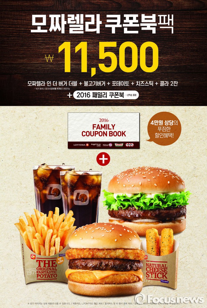 모짜렐라 쿠폰북 팩은 △모짜렐라 인 더 버거 – 더블 △불고기버거 △치즈스틱 △감자튀김 △콜라 2잔으로 구성된 제품이다. 가격은 1만1500원.