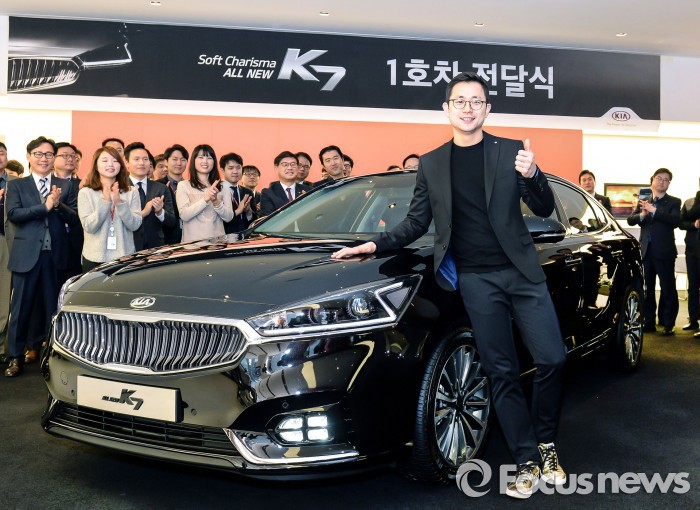 한편 지난달 26일 출시된 ‘올 뉴 K7’은 사전계약 기간 2주 동안 7500대의 계약대수를 기록하는 등 인기를 끌고 있으며, 기아차는 국내 출시를 시작으로 올해 미국, 중동 등 글로벌 주요 시장에 ‘올 뉴K7’을 선보이며 해외시장 공략에도 박차를 가할 계획이다.기아차는 지난달 28일 오후 서울 압구정동 기아자동차 사옥에서 김창식 국내영업본부장(부사장)을 비롯한 임직원들이 참석한 가운데 최동혁 씨에게 '올 뉴 K7' 1호차를 전달하고 200만원 상당의 주유 상품권을 증정했다.‘올 뉴 K7’ 1호차 주인공 최동혁 씨가 차량 전달식 후 기념 촬영을 하고 있는 장면. <사진제공=기아자동차>