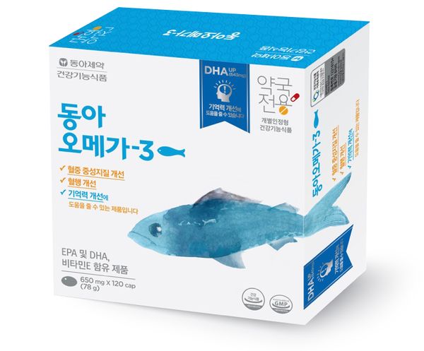 동아제약에 따르면 ‘동아 오메가-3’는 DHA함유량을 EPA 함유량보다 2.5배 높인 개별인정형 원료를 사용해 혈중 중성지질, 혈행 개선 기능 외에도 기억력 개선에도 도움을 줄 수 있다.