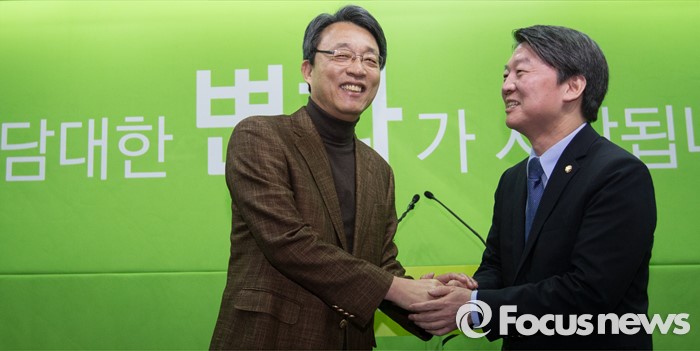 (서울=포커스뉴스) 안철수 국민의당 인재영입위원장이 1일 오전 서울 마포구 국민의당 당사에서 합류 기자회견을 마친 김성식 전 의원과 인사를 나누고 있다.