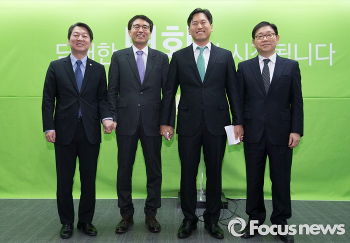 (서울=포커스뉴스) 안철수 국민의당 인재영입위원장이 1일 오전 서울 마포구 국민의당 당사에서 국민의당 합류 인사들을 소개하는 기자회견을 마치고 합류 인사들과 손을 잡고 포토타임을 갖고 있다. 왼쪽부터 안철수 인재영입위원장, 정필재 변호사, 손금주 변호사, 국성근 전남대 교수