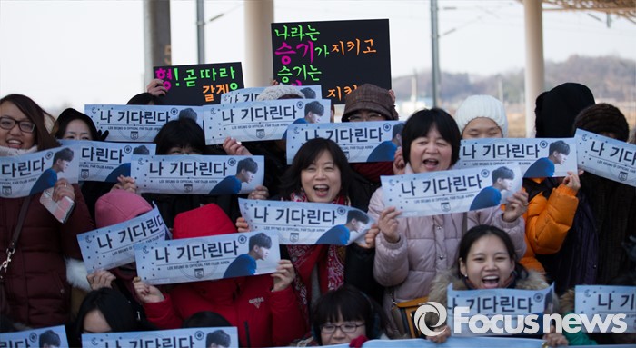 (논산=포커스뉴스) 1일 오후 충남 논산 육군훈련소 앞에서 가수 겸 배우 이승기의 팬들이 응원 문구가 적힌 현수막을 들고 입소를 기다리고 있다.