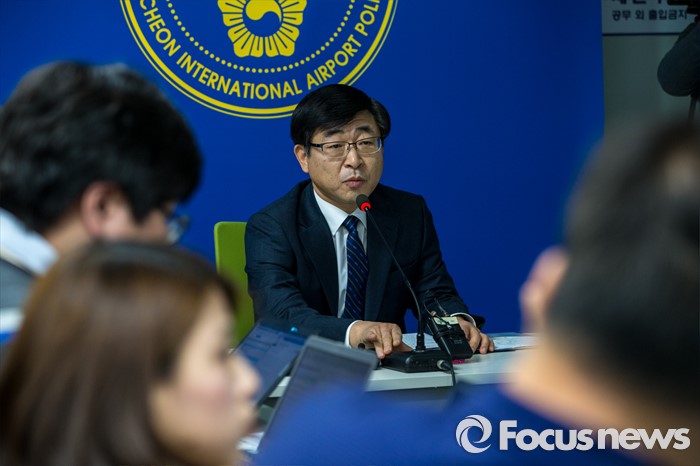 (인천공항=포커스뉴스) 인천국제공항에 폭발물 의심 물체와 함께 아랍어로 된 협박성 메모가 발견된 사건 수사가 진행되고 있는 1일 오후 인천공항경찰대에서 정성채 인천공항경찰대장이 사건 관련 브리핑을 하고 있다.