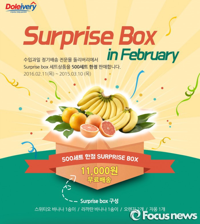 (서울=포커스뉴스) 청과회사 돌(Dole) 코리아는 온라인 수입과일 쇼핑몰 ‘돌리버리’(Doleivery)에서 500세트 한정 ‘2월의 서프라이즈 박스’(Surprise Box in February)를 오는 11일부터 3월10일까지 판매한다.