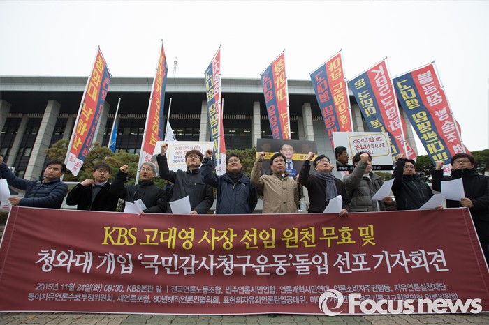 이들은 "수사기관이 수사에 착수해 사법처리하기까지 많은 시간이 소요된다. 검찰수사와 별도로 감사원의 신속한 감사와 조치가 필요하다"며 "문체부의 방 전 사장 사의 수용도 부적절하면 철회하도록 해야한다"고 강조했다.지난해 11월 24일 오전 서울 영등포구 KBS 본관 앞에서 고대영 신임 KBS 사장 후보자 선임 무효 기자회견 참석자들이 구호를 외치고 있다. 김유근 기자