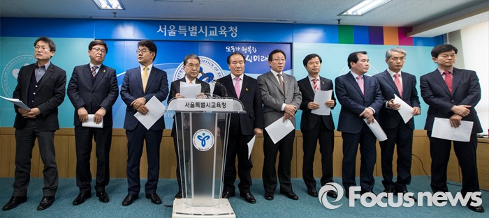 이날기자회견에는 조희연 서울교육감, 김석준 부산교육감, 이청연 인천교육감, 장휘국 광주교육감, 설동호 대전교육감, 최교진 세종교육감, 이재정 경기교육감, 민병희 강원교육감, 김병우 충북교육감, 김지철 충남교육감, 김승환 전북교육감, 장만채 전남교육감, 박종훈 경남교육감, 이석문 제주교육감 등이 참석했고 우동기 대구교육감, 김복만 울산교육감, 이영우 경북교육감 등은 동참하지 않았다.3일 오후 서울시교육청에서 열린 '누리과정 문제 해결 촉구' 기자회견에서 전국 교육감들이 결의문을 발표하고 있다. 2016.02.03 양지웅 기자
