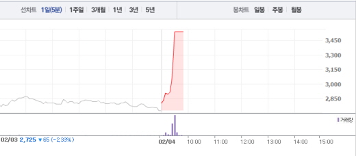 4일 오전 9시45분 현재 웰크로한텍은 전날보다 815원(29.91%) 오른 3540원에 거래되고 있다.