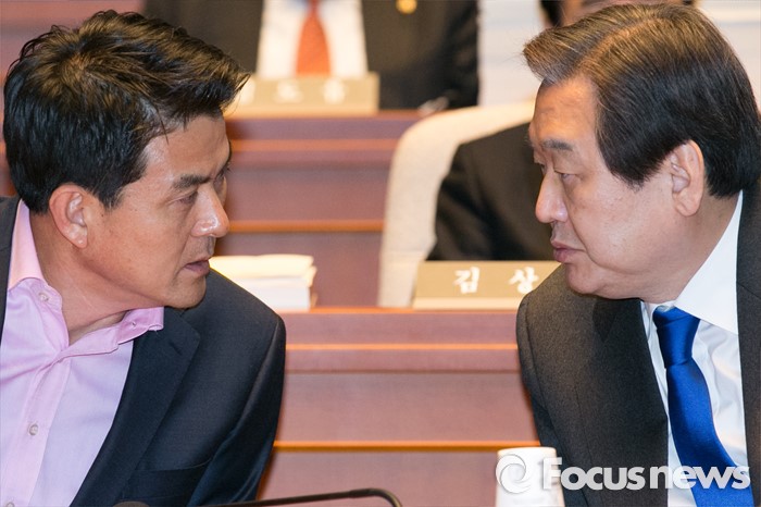 또 "과감하게 개방해서 천하의 인재들을 영입해야 한다. 그 공간 만들어야 한다"며 "들어올 사람 중요하지만 이제 우리 지도부가 인재영입을 위한 개방의 방향을 뚜렷하게 국민들에게 밝혀야 한다"고 김 대표를 압박했다.김태호 새누리당 최고위원이 4일 "상향식 공천이 소중하다고 생각하지만 명분과 현실은 너무 다르게 흘러가고 있다"며 김무성 새누리당 대표에게 맞섰다. 사진은 지난 1월29일 김 대표와 김 위원이 의원총회에서 대화를 나누는 모습. 2016.02.04 박철중 기자