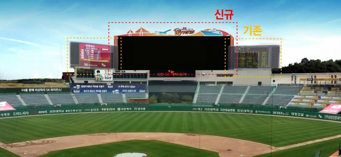 장순일 사업본부장은 "전광판 교체로 인해 인천SK행복드림구장은 SK와이번스가 지향하는 ICT야구장으로 첫 걸음을 내디뎠다고 생각한다. 빅보드를 인천 야구팬들이 자부심을 느끼고 인천SK행복드림구장이 지역 랜드마크로 자리잡을 수 있도록 노력하겠다"고 밝혔다.프로야구 SK가 홈구장인 문학구장에 전세계 야구장 중 최대규모 전광판을 설치한다. 사진은 기존 전광판과 신규 전광판 비교 그래픽. <사진제공=SK 와이번스>