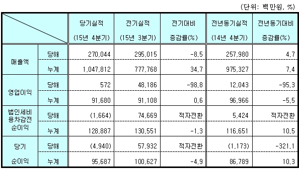 한편, 지난해 7조원대 신약 기술수출에 성공한 한미약품은 2015년 누적 연결회계 기준으로 전년대비 73.1% 성장한 1조3175억원 매출을 달성했으며, 영업이익 2118억원, 순이익 1622억원을 기록했다고 공시했다.녹십자 2015년 경영실적(연결기준) <자료출처=녹십자>