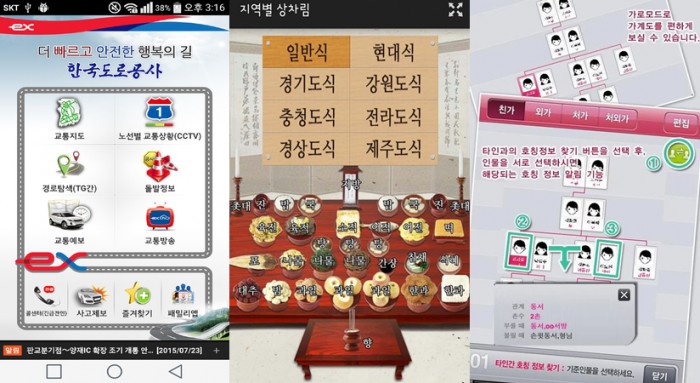 이밖에 귀경시 도로파손, 불법주차 등 불편사항은 행자부에서 제공하는 '생활불편 스마트폰신고' 민원서비스를 이용하면 편리하다.설연휴 유용한 앱들. 왼쪽부터 고속도로 교통정보, 제사의 달인, 패밀리 앱. <사진제공=각 사>