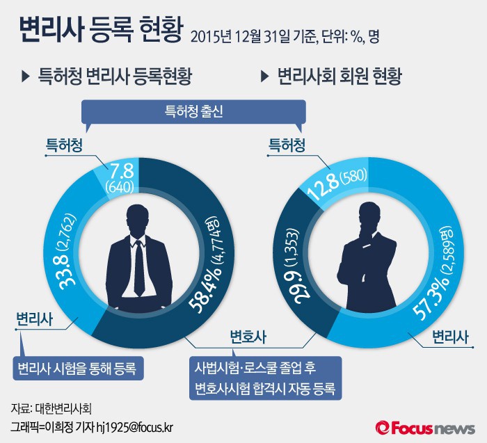 2015년 12월 31일 기준 특허청에 등록된 변리사 8176명 중 변리사시험을 통해 등록된 인원은 2762명(33.8%)이다.