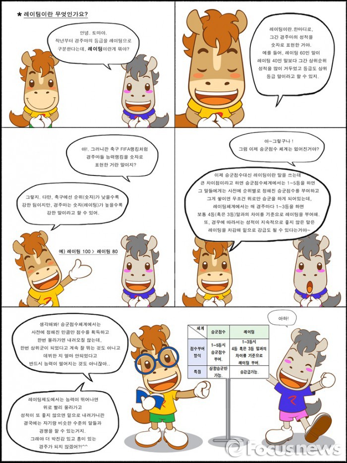 홍보만화는 레이팅 제도를 설명하고 있다. 레이팅 제도는 지난 2015년 한국 마사회가 발표한 경마 혁신방안의 핵심이다. 경주마의 능력을 숫자로 표현해, 능력이 뛰어날수록 높은 숫자를 받는다.