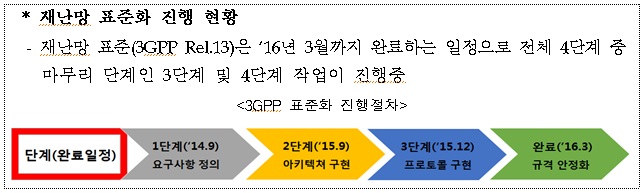 강성주 미래부 인터넷융합정책관은 “재난망 표준을 마무리하는 최종 회의를 국내에서 개최하면서 3GPP 표준이 올해 3월 일정대로 완료될 것으로 기대된다”며 “이는 미국, 영국 등과 긴밀한 국제공조를 통해 이루어낸 쾌거이며 재난망 사업이 차질 없이 진행될 수 있는 근간이 마련될 것“이라고 밝혔다.재난망 표준화 진행 현황.<그래프제공=미래부>