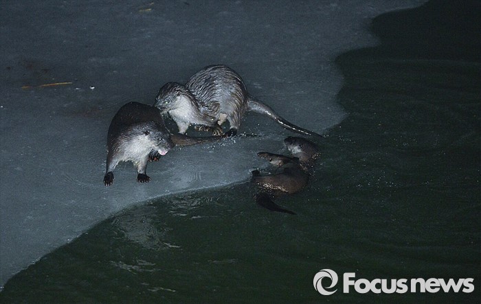 한 가족처럼 보이는 수달무리는 15일 엄습한 한파로 습지 상류가 얼어붙자, 얼지 않은 물속에서 차례로 얼음판위로 올라오더니 민물과 바닷물이 겹치며 얼지 않는 흐르는 물가로 달려가 거대한 잉어를 사냥했다.