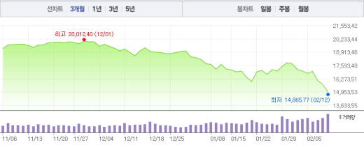 니케이지수는 지난 9일(-5.4%), 10일(-2.3%)에 이어 12일에도 5%에 가까운 급락을 기록하면서 1만5000선 아래로 밀렸다.주가흐름<사진출처=네이버 캡쳐>