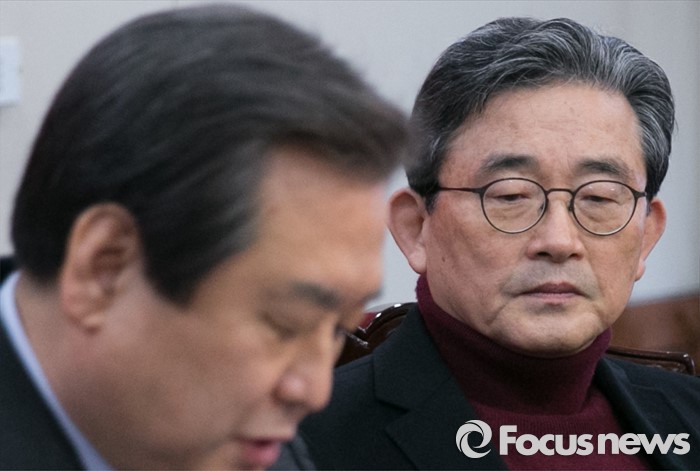 홍문표 부총장은 기자들과 만나 "이런 저런 논의만 있었던 것을 이한구 공관위장이 그냥 발표한 것"이라며 "저렇게 불쑥 발표해버리니 수습이 안된다"고 말했다.이한구(오른쪽) 새누리당 공천관리위원장이 11일 오전 서울 여의도 당사에서 열린 공천관리위원회 임명장 수여식에 참석해 김무성 대표의 모두발언을 듣고 있다. 2016.02.11 박동욱 기자