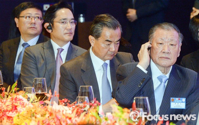 롯데는 25명 중 4명(16.0%), 금호아시아나는 6명 중 1명(16.7%)을 신규 선임해 교체율이 10%대에 불과했다. 현대차(20.0%), 대림(25.0%), CJ(29.4%), LG(31.6%), 두산·영풍(33.3%) 등이 3분의 2 이상을 유임시켜 경영 안정을 기했다.(서울=포커스뉴스)1일 오후 서울 중구 신라호텔에서열린 ‘리커창 중국 총리 초청 한국 경제계와의 간담회’에 참석자들이 리커창 중국총리의 인사말을 듣고 있다. 사진 오른쪽부터 정몽구 현대자동차그룹 회장, 왕이 중국외교부 부장, 이재용 삼성전자 부회장. <사진제공= 한국사진기자협회> 2015.11.01 포커스포토