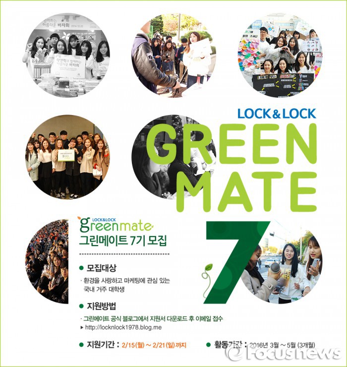 (서울=포커스뉴스) 락앤락은 오는 21일까지 공식 대학생 서포터즈 ‘그린메이트 7기’를 모집한다. 그린메이트는 대학생에게 친환경 소비습관을 일깨우고 마케팅 활동의 경험을 제공하는 대외활동이다.