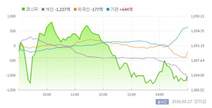 이날 코스피는 전일 대비 0.06% 상승한 1889.41로 장을 시작했다. 그러나 개인과 외국인이 동반 팔자에 나서면서 하락세로 돌아섰다.