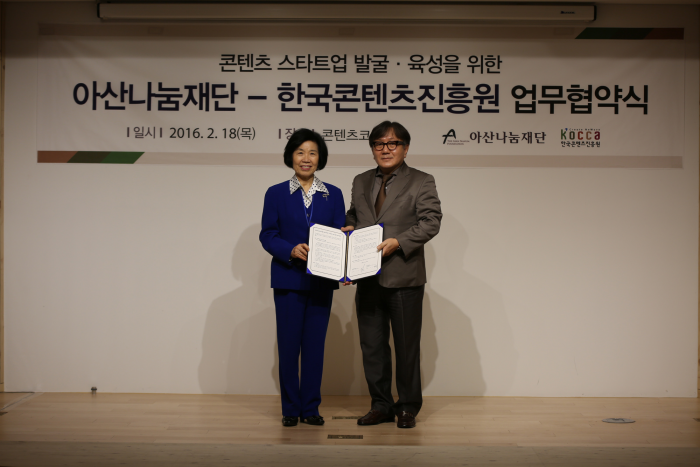 (서울=포커스뉴스) 한국콘텐츠진흥원과 아산나눔재단이 콘텐츠 스타트업 발굴 및 스타트업 생태계 활성화를 위해 손잡았다.