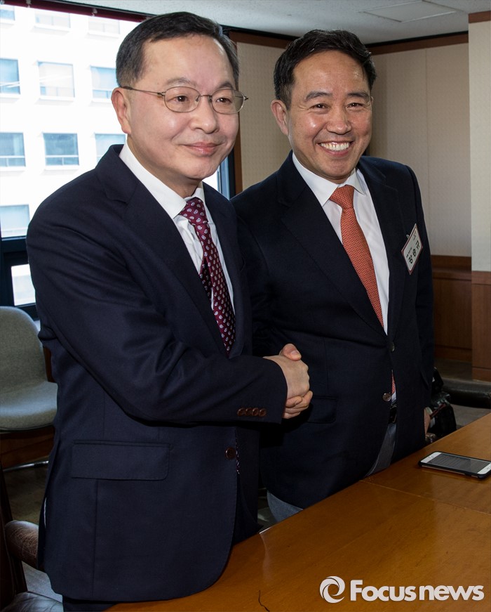 | △ 악수하는 안대희·강승규 |