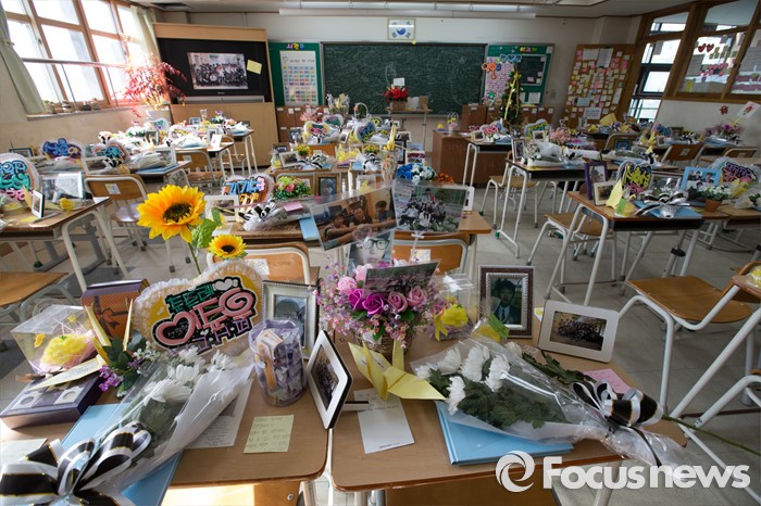추 교장의 후임은 정광윤 경기체육중학교 교감이 맡을 예정이다.(안산=포커스뉴스) 단원고 생존 학생들의 졸업식이 열린 12일 오후 경기도 안산시 단원고등학교에 희생자 아이들의 책상이 꾸며져 있다. 2016.01.12 허란 기자