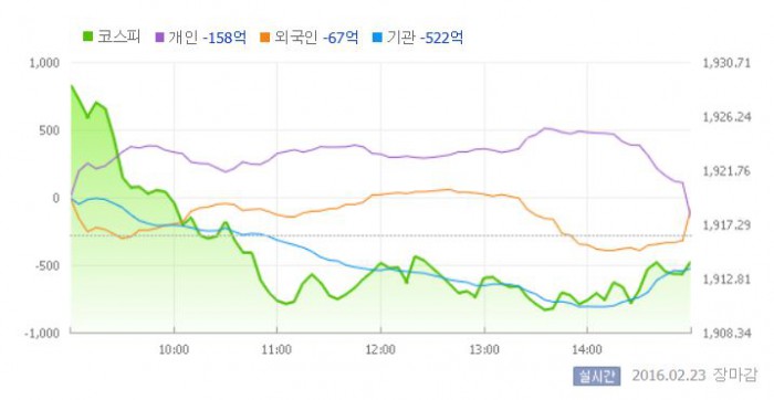 이날 코스피는 전일대비 0.65% 상승한 1928.85로 장을 시작했다. 이후 지수는 외국인과 기관의 대규모 팔자세에 하락세로 방향을 바꿨다. 개인, 외국인, 기관은 이날 각각 164억원, 49억원, 514억원 어치 물량을 팔아 치웠다.