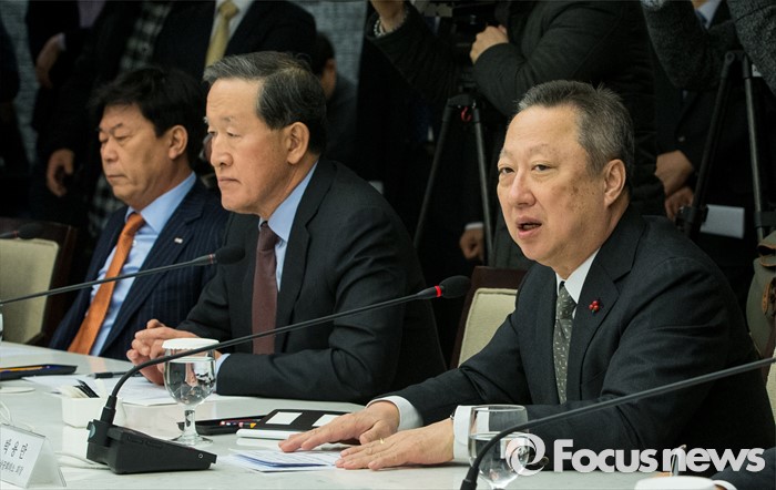 이날 기자회견에는 대한상의 이동근 상근부회장, 전경련 이승철 상근부회장, 무협 김정관 상근부회장, 중기중앙회 소한섭 본부장, 경총 이동응 전무, 중견련 박양균 본부장 등이 참석했다.(서울=포커스뉴스) 지난 2일 오전 서울 중구 대한상공회의소에서 열린 '경제장관-경제단체장 간담회'에서 박용만 대한상의 회장이 인사말을 하고 있다. 양지웅 기자