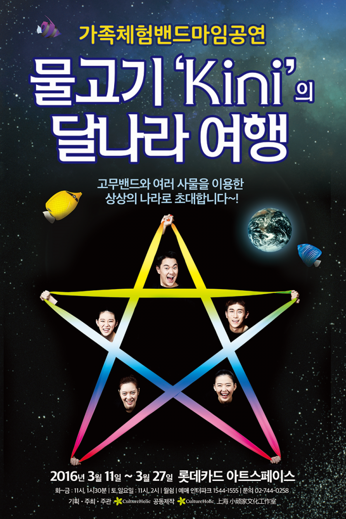 제작사 컬쳐홀릭 관계자는 "대표적인 넌버벌퍼포먼스인 '점프'를 비롯해 국내외 다양한 작품에서 노하우를 쌓아온 제작진과 공연의 퀄리티를 유지시켜주는 역할을 하는 쇼닥터가 참여해 작품의 예술성과 완성도를 높였다"고 밝혔다.(문의 1566-5588)'물고기 Kini의 달나라 여행' 포스터.<사진제공=컬쳐홀릭>