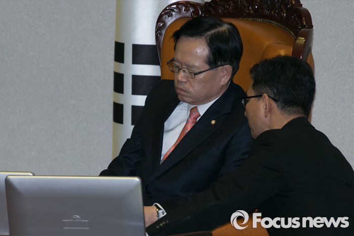 (서울=포커스뉴스) 정의화(왼쪽) 의장이 23일 오후 서울 여의도 국회 본회의장에서 큰 숨을 쉬고 있다.