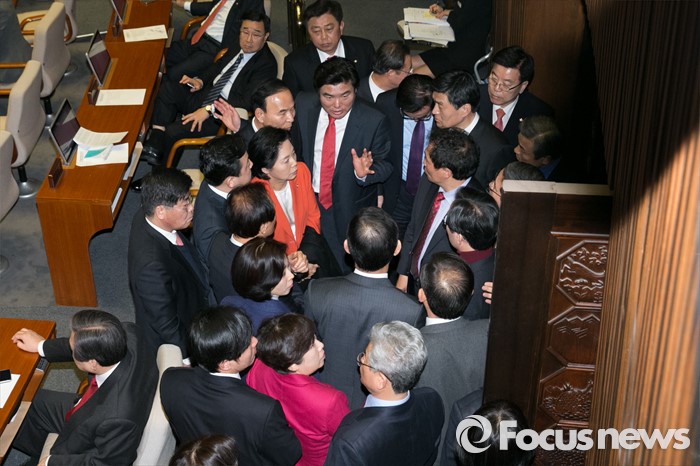 (서울=포커스뉴스) 원유철 새누리당 원내대표를 비롯한 여당 의원들이 23일 오후 서울 여의도 국회 본회의장에서 테러방지법과 관련해, 김광진 더불어민주당 의원이 무제한 반대토론하는 동안, 논의하고 있다.