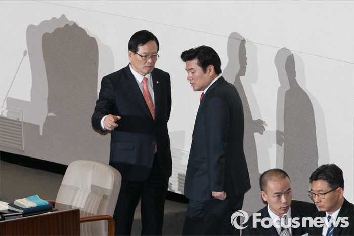 (서울=포커스뉴스) 정의화(왼쪽) 의장과 원유철(왼쪽 두번째) 새누리당 원내대표가 23일 오후 서울 여의도 국회 본회의장에서 논의하고 있다.