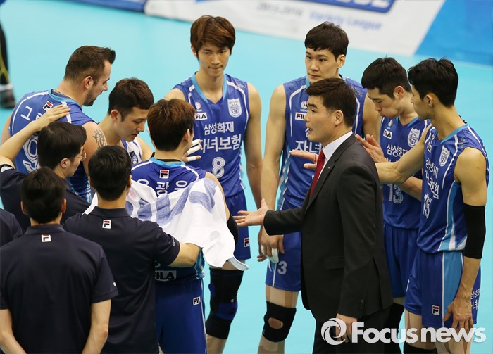 (수원=포커스뉴스) 23일 수원실내체육관에서 열린 '2015-2016NH농협 V-리그' 남자부 한국전력-삼성화재 경기에서 삼성화재 임도헌 감독이 선수들에게 작전을 지시하고 있다.