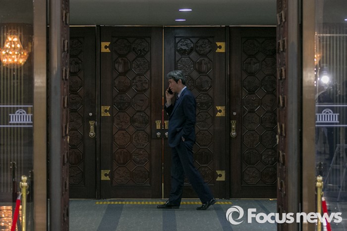 (서울=포커스뉴스) 이인영 더불어민주당 의원이 23일 오후 서울 여의도 국회 본회의장 정문 앞에서 전화를 받으며 걷고 있다. 이 시간 본회의장에서는 테러방지법과 관련한 김광진 더민주 의원의 무제한토론이 진행되고 있다.