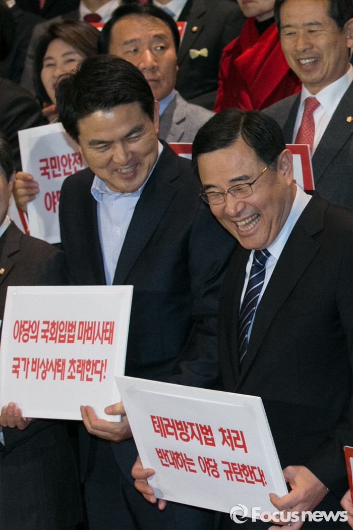 (서울=포커스뉴스) 김정훈(앞줄 오른쪽) 새누리당 정책위의장과 김태호(앞줄 왼쪽) 최고위원이 23일 오후 서울 여의도 국회 로텐더홀에서 테러방지법과 관련한 야당의 필리버스터에 대해 규탄성명 발표 전 크게 웃고 있다.