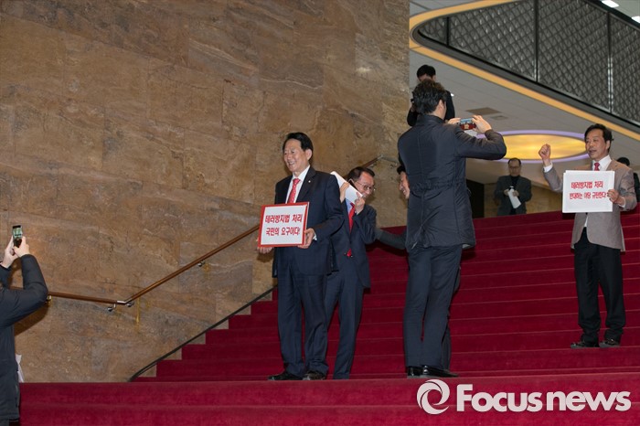 (서울=포커스뉴스) 새누리당 의원들이 23일 오후 서울 여의도 국회 로텐더홀에서 테러방지법과 관련한 야당의 필리버스터에 대해, 규탄성명을 발표한 뒤 기념사진을 찍고 있다.