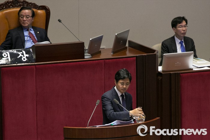 (서울=포커스뉴스) 김광진(가운데) 더불어민주당 의원이 23일 오후 서울 여의도 국회 본회의장에서 테러방지법과 관련해 무제한 토론을 하던 중, 물을 따르고 있다.