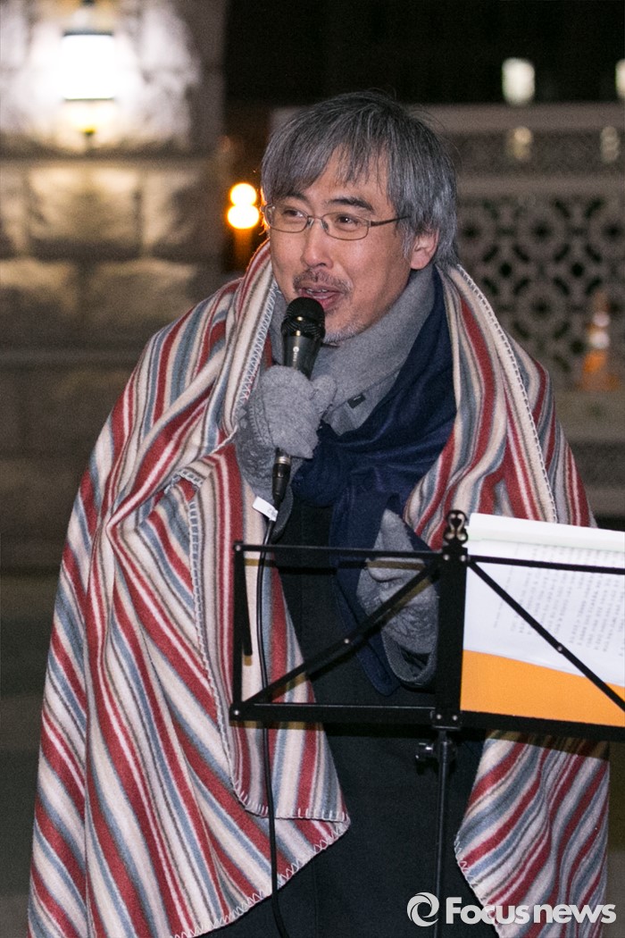 (서울=포커스뉴스) 이태호 참여연대 사무처장이 24일 오전 서울 여의도 국회 정문 앞에서 테러방지법 처리를 반대하는 시민 필리버스터를 진행하고 있다.
