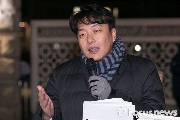 (서울=포커스뉴스) 한 시민이 24일 오전 서울 여의도 국회 정문 앞에서 테러방지법 처리를 반대하는 시민 필리버스터에 참여해 연설을 하고 있다.