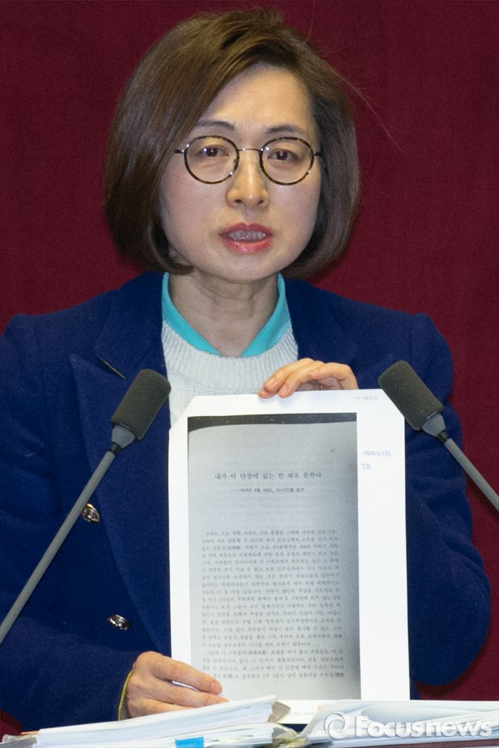 (서울=포커스뉴스) 은수미 더불어민주당 의원이 24일 오전 서울 여의도 국회 본회의장에서 테러방지법과 관련해, 무제한 토론 중, 고 김대중 전 대통령의 필리버스터 자료를 보이고 있다.