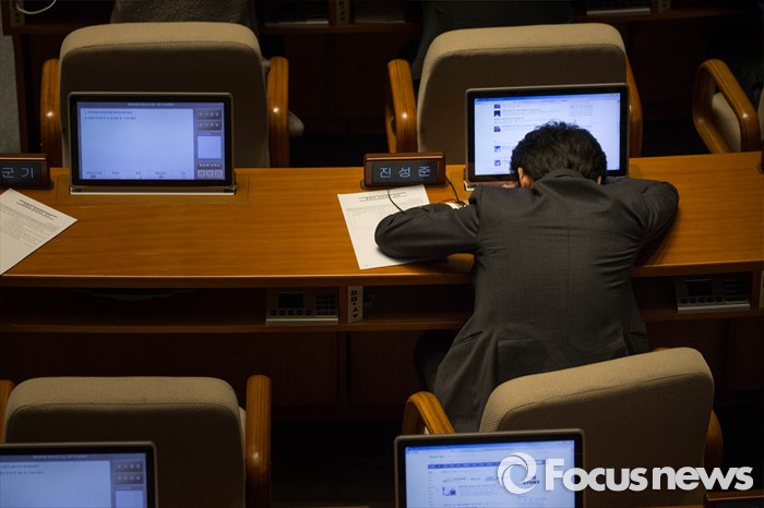 (서울=포커스뉴스) 테러방지법 처리 저지를 위한 야당의 릴레이 필리버스터가 진행중인 24일 오전 진성준 더불어민주당 의원이 서울 여의도 국회 본회의장에서 쪽잠을 자고 있다.