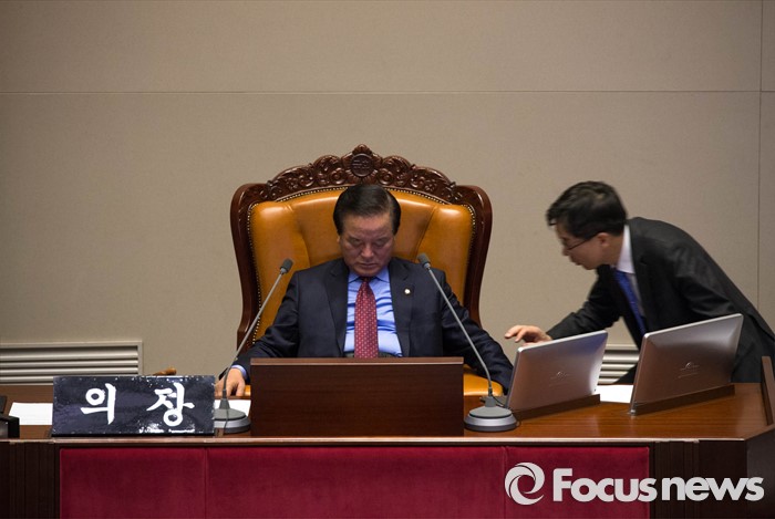 (서울=포커스뉴스) 정갑윤 국회부의장이 24일 오전 서울 여의도 국회 본회의에서 은수미 더불어민주당 의원이 테러방지법과 관련, 무제한 토론을 하는 동안 의장석에 앉아 졸고 있다.