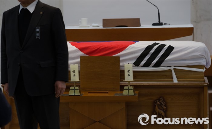(서울=포커스뉴스) 24일 오전 서울 서초구 서울성모병원에서 故 이기택 전 민주당 총재의 발인 예배가 진행되고 있다.