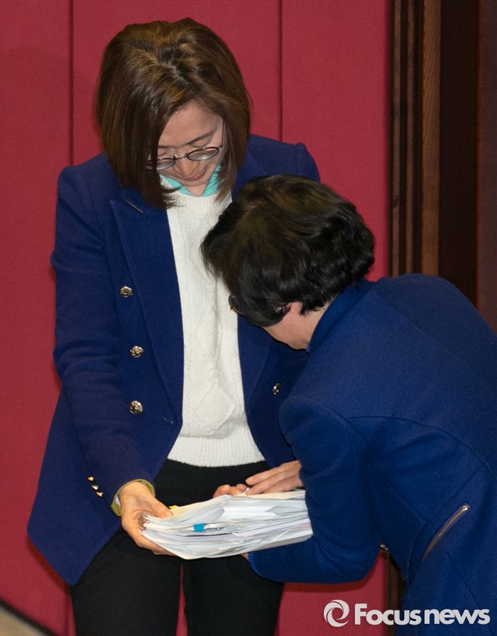 (서울=포커스뉴스) 테러방지법 직권상정에 반발해 야당의 무제한 토론(필리버스터)이 진행되고 있는 24일 오후 서울 여의도 국회 본회의장에서 토론을 마친 은수미(왼쪽) 더불어민주당 의원의 자료를 김현 의원이 대신 들어주고 있다.