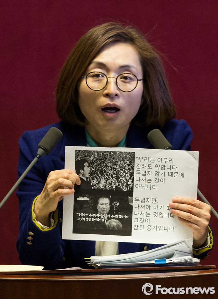 (서울=포커스뉴스) 테러방지법 직권상정에 반발해 야당의 무제한 토론(필리버스터)이 진행되고 있는 24일 오후 서울 여의도 국회 본회의장에서 토론에 참여한 은수미 더불어민주당 의원이 발언 중, 고 김대중 전 대통령에 대한 얘기를 하고 있다. 은 의원은 이날 10시간 18분의 토론을 기록해 국내 최장기록인 10시간 15분을 경신했다.