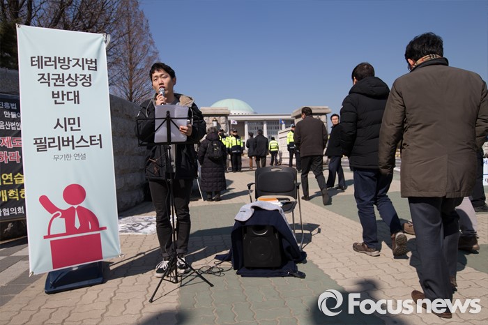 (서울=포커스뉴스) 24일 오후 서울 여의도 국회 정문 앞에서 테러방지법 처리를 반대하는 시민이 필리버스터에 참여해 연설을 하는 가운데 주위로 시민들이 지나가고 있다.