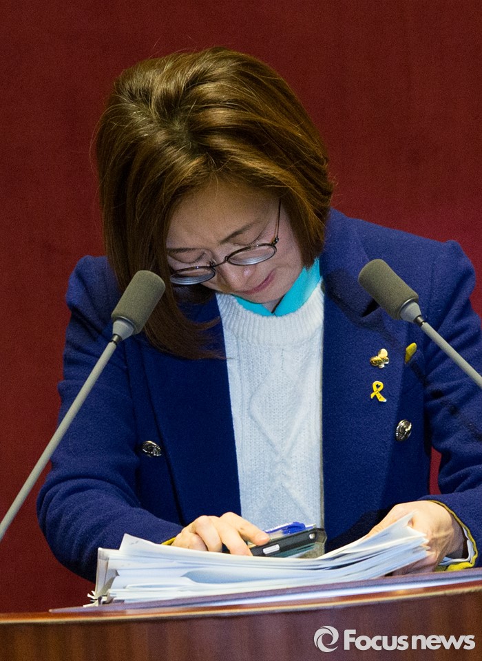 (서울=포커스뉴스) 테러방지법 직권상정에 반발해 야당의 무제한 토론(필리버스터)이 진행되고 있는 24일 오후 서울 여의도 국회 본회의장에서 토론에 참여한 은수미 더불어민주당 의원이 발언을 끝내고 눈물짓고 있다. 은 의원은 이날 10시간 18분의 토론을 기록해 국내 최장기록인 10시간 15분을 경신했다.