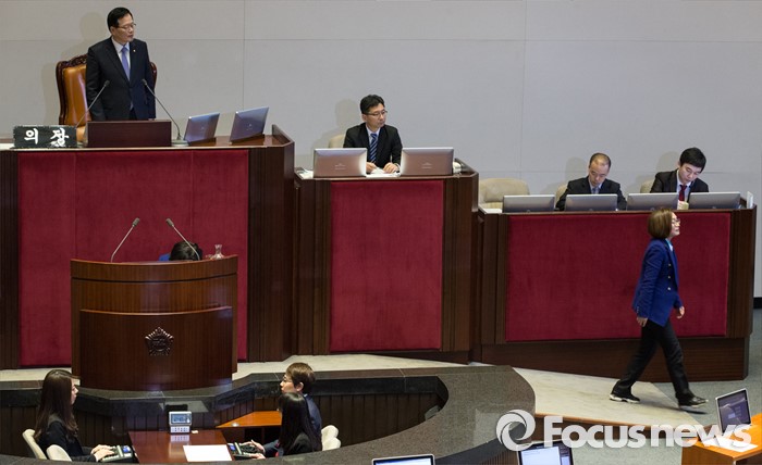 (서울=포커스뉴스) 테러방지법 직권상정에 반발해 야당의 무제한 토론(필리버스터)이 진행되고 있는 24일 오후 서울 여의도 국회 본회의장에서 토론에 참여한 은수미 더불어민주당 의원이 발언을 끝내고 퇴장하고 있다. 은 의원은 이날 10시간 18분의 토론을 기록해 국내 최장기록인 10시간 15분을 경신했다.